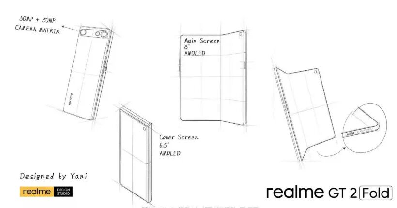 昨天 realme GT 2 Fold 手机的设计草图在互联网上被曝光。这款设计图左下角注明设计师的名称为 Yani,同时有着 realme 设计工作室商标。不过,目前暂时无法确认这张草图的真实性。
