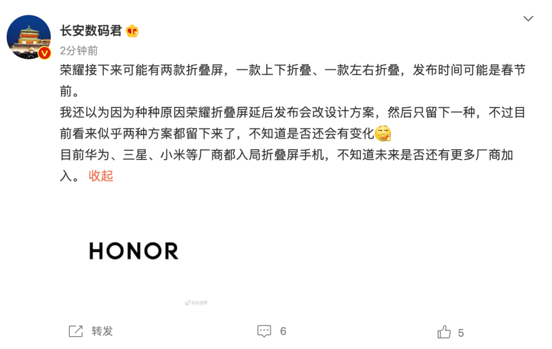 据长安数码君消息,荣耀可能在春节前发布两款折叠屏手机,一款上下折叠,一款左右折叠。