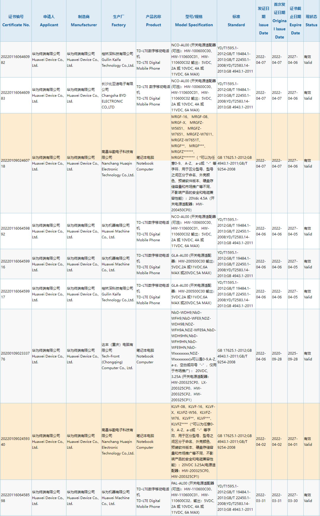 华为近日有多款设备通过了国家 3C 质量认证,包括 NCO-AL00 和 GLA-AL00 这两款 4G 手机以及多款笔记本电脑。