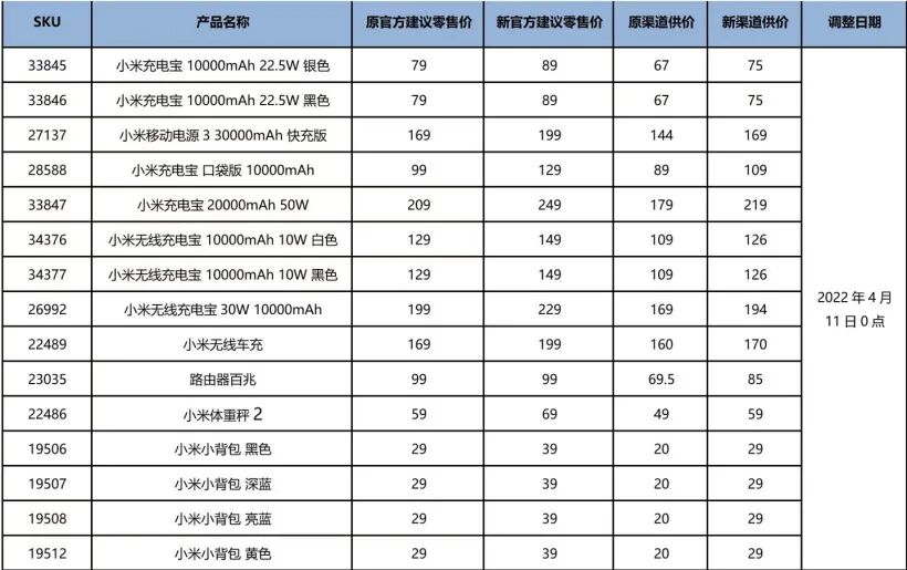4 月 11 日消息,此前网上流出一份表单显示,今日(4 月 11 日)起,小米彩虹电池、充电宝等多款产品将涨价。今天从小米商城的价格来看,这些表单中的产品确实已经涨价。