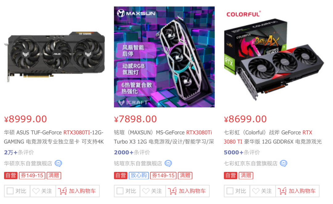 RTX 3080 Ti 显卡于 2021 年 6 月发布,首发价为 8999 元起。目前,在京东自营平台上,华硕的 RTX 3080 Ti TUF 型号已经降到了首发价,而七彩虹和铭瑄的等厂家的一些 RTX 3080 Ti 已经降到首发价以下。一些第三方商家的 RTX 3080 Ti 售价更低。(来源:IT之家)