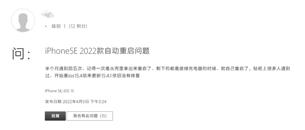 在苹果支持社区,有用户表示,iPhone SE3半个月遇到四五次。“记得一次是从兜里拿出来重启了,剩下的都是拔掉充电器的时候,就自己重启了。”