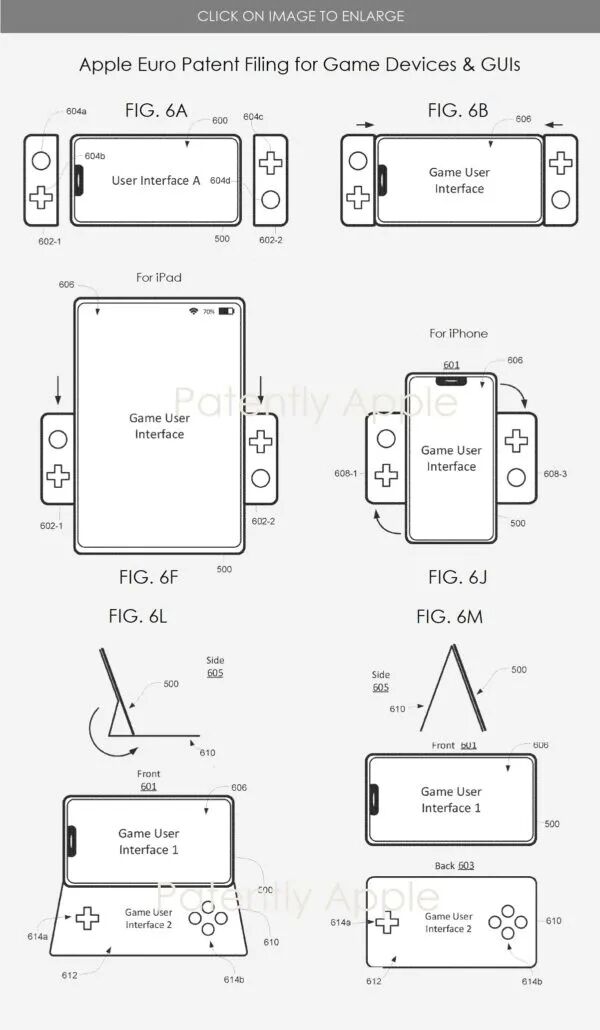 专利显示,苹果正在测试三种游戏手柄的样式。第一种为专利图中的 6A、6B、6F、6J,看起来有点像 Switch 的 JoyCon 手柄,能够将 iPhone 和 iPad 变成一个便携式游戏设备,其中一半手柄可以连接到 Lightning 接口,但不清楚另一半手柄如何与 iPhone 配对,苹果有可能会采用无线方式进行连接。(来源:IT之家)