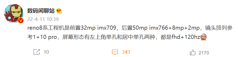 今日,数码博主 @数码闲聊站 曝光了 OPPO Reno8 系列工程机的部分配置。爆料信息显示,OPPO Reno8 系列工程机前置 32MP IMX709 传感器,后置 50MP IMX766+8MP+2MP 组合,镜头排列与一加 10 Pro 类似。