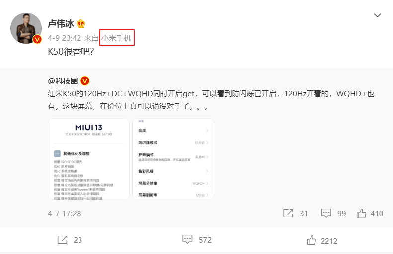 4 月 11 日消息,小米集团合伙人,中国区、国际部总裁,Redmi 品牌总经理卢伟冰近日发布了一条微博,晒出了“小米手机”的小尾巴,引发网友猜测。