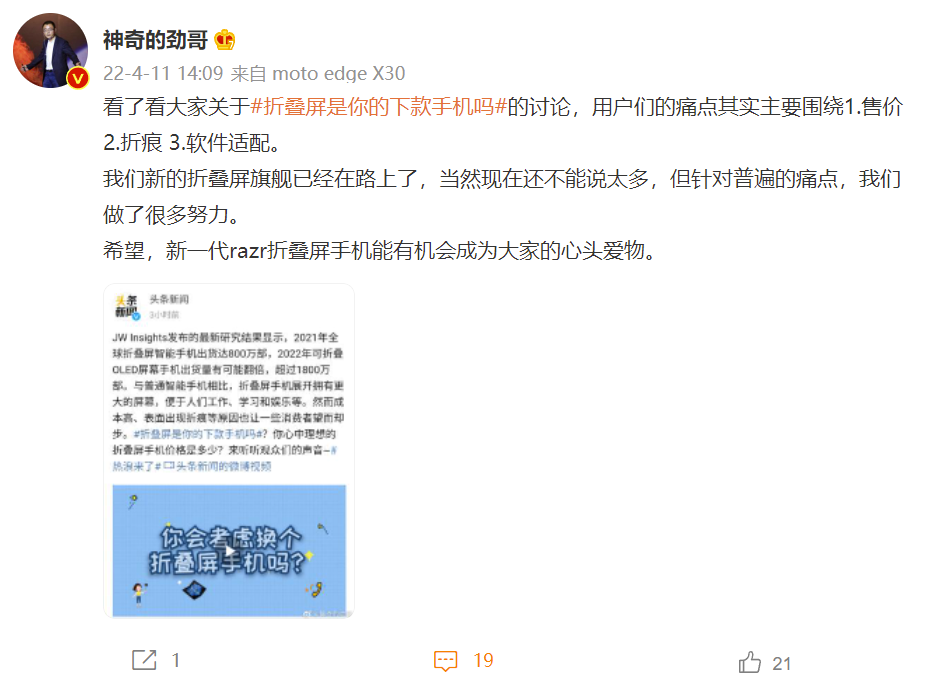 今日,联想中国区手机业务部总经理陈劲通过社交媒体表示,看了看大家关于“折叠屏是你的下款手机吗”的讨论,用户们的痛点其实主要围绕着售价、折痕、软件适配。