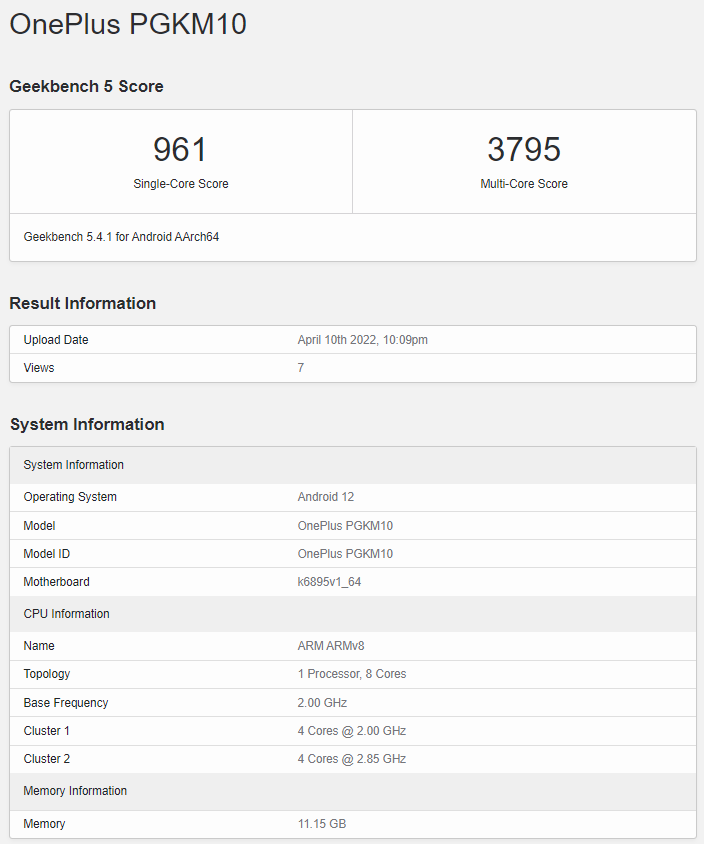 4 月 11 日消息,一加的一款新机出现在 GeekBench 5 跑分中,搭载天玑 8100 芯片,型号为 PGKM10,消息称命名为一加Ace。
