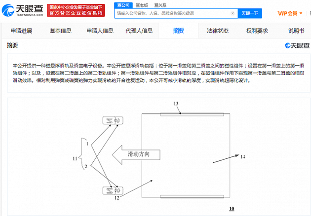 专利摘要显示,本公开的磁悬浮滑轨包括位于第一滑盖和第二滑盖之间的磁性组件;分别设置在第一滑盖、第二滑盖上的滑轨组件,通过磁性组件作用,实现滑盖的滑动效果。相对利用弹簧或碟簧的弹力实现滑轨的开合往复运动,本公开可减小滑轨的厚度,实现滑轨超薄化设计。(来源: 新浪科技)