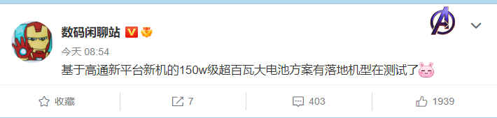 据微博博主 @数码闲聊站 称,小米基于高通新平台新机的 150W 级超百瓦大电池方案有落地机型在测试了。并且以目前测试的速度,落地可能会更快。