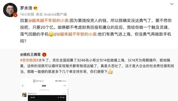 昨天,在回复网友有没有勇气再做款手机的提问时,罗永浩回复称:因为要烧投资人的钱,所以我确实没这勇气了。