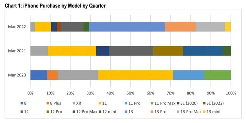这份报告的主要调查结果显示,iPhone 13 在单款机型中的份额是几年来最高的,达到 38%,而 iPhone mini 机型只吸引了很小的买家份额 —— 总共只有 3%。此外,购买者现在保留旧手机的时间更短,扭转了长期趋势。