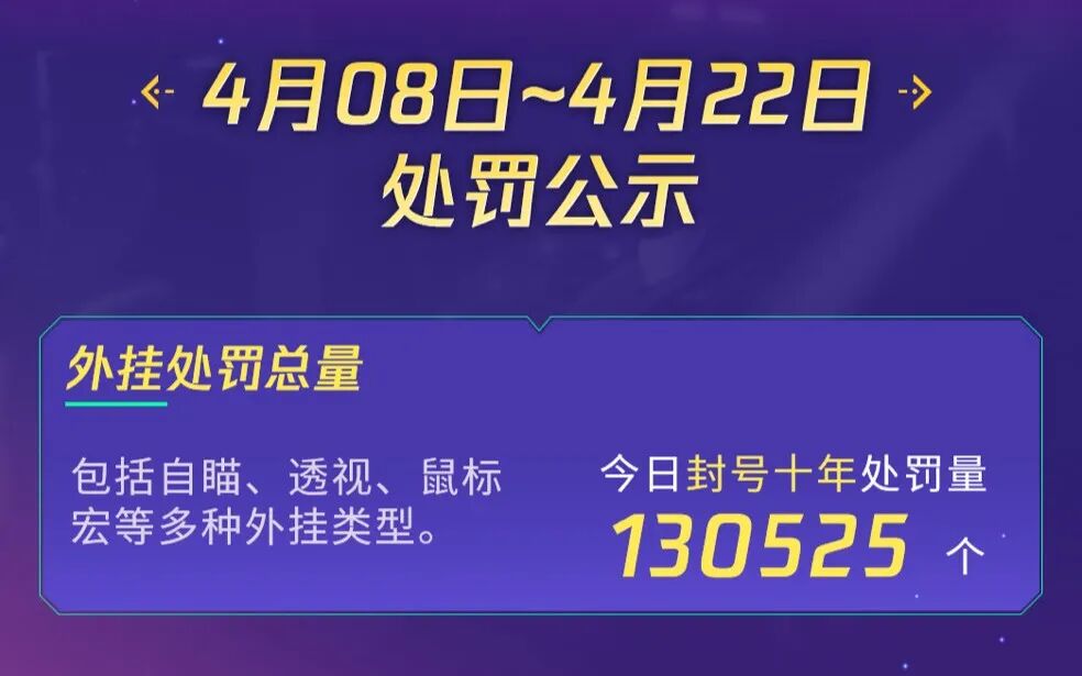 据腾讯游戏安全中心消息,在 4 月 8 日到 22 日,因在《穿越火线》使用包括自瞄、透视、鼠标宏等外挂而封号 10 年的账号达到 130525 个。此外,在《CFHD》中,因使用外挂封号 10 年的账号为 1928 个,还有 67 个账号因坐挂车被处罚。