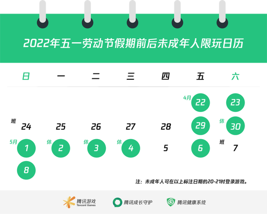4月22日,腾讯发布五一劳动节假期前后未成年人游戏限玩通知,通知要求工作日,以及调休上班的4月24日(周日)和5月7日(周六),均为禁玩时段。