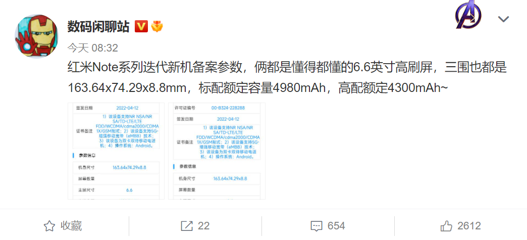 今日某数码博主爆料称Redmi Note 12系列已经入网,并且公布了基础参数。本次入网的为Redmi Note 12系列中的标准版和高配版,这两款机型均采用6.6英寸高刷屏幕,机身三围也都是163.64x74.29x8.8mm。