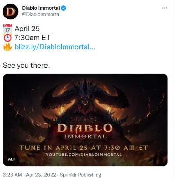 今日,《暗黑破坏神:不朽 》官方宣布将于 4 月 25 日北京时间 19.30(美国东部时间 7.30)举办直播活动,考虑到此前官方表示会在今年上半年推出,预计届时就会公布游戏的正式上线日期。