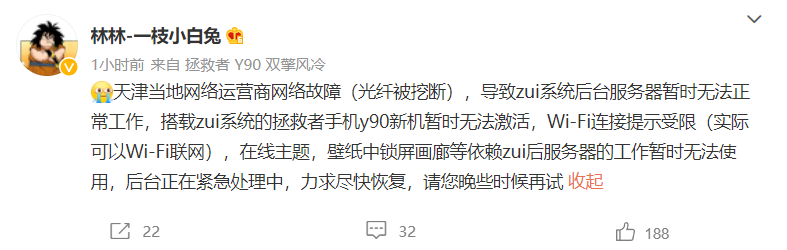 4 月 23 日消息,联想产品经理林林今日上午在微博称,天津当地网络运营商网络故障(光纤被挖断),导致 ZUI 系统后台服务器暂时无法正常工作。