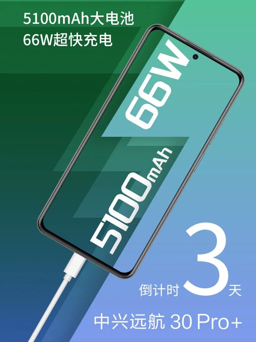 其中,中兴远航 30 Pro+ 将支持 5100mAh 大电池 + 66W 快充,采用居中挖孔屏幕。(来源:IT之家)