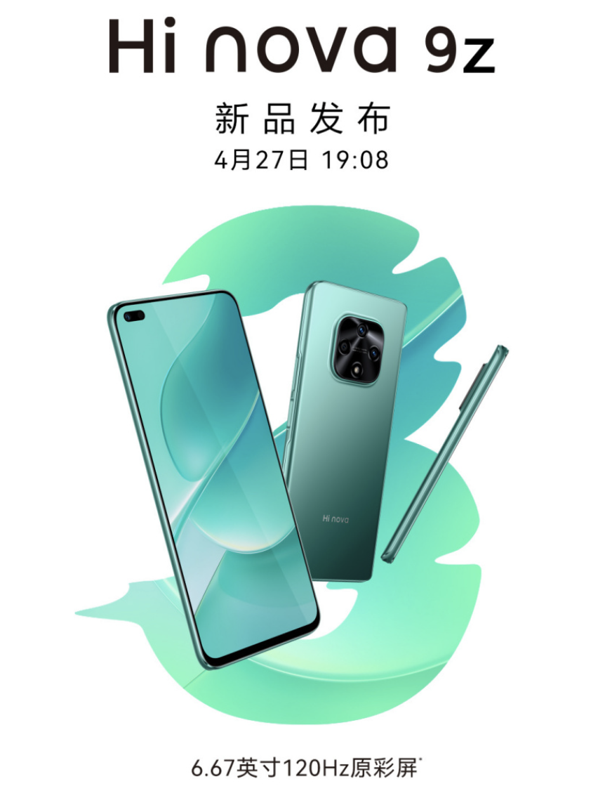 Hi nova 9z 官宣将于 4 月 27 日 19:08 发布,搭载 6.67 英寸 120Hz 原彩屏,后置居中方块三摄,前置左上角药丸挖孔。