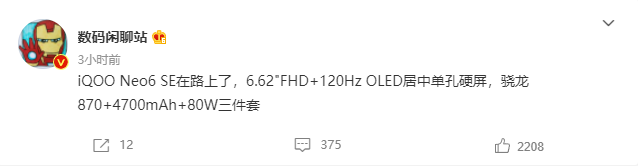 近日,微博数码博主@数码闲聊站 曝光 iQOO Neo6 SE 的基础配置信息,将采用 6.62 英寸 OLED 居中挖孔屏,支持 120Hz 高刷新率,搭载骁龙870 处理器,配备一块 4700mAh 电池和 80W 闪充。