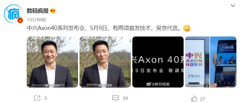 中兴 Axon 40 系列已经官宣,搭载屏下摄像头。据数码博主 @数码疯报 曝光的视频截图,中兴 Axon 40 系列将于 5 月 9 日发布,由吴京代言,首发两项技术。