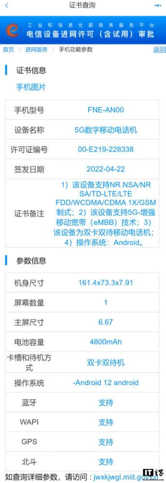 荣耀一款型号为 FNE-AN00 的新机已入网工信部,搭载 6.67 英寸 1080P OLED 屏,额定 4800mAh 电池,厚度为 7.91mm,与之前曝光的荣耀 70 系列参数一致。