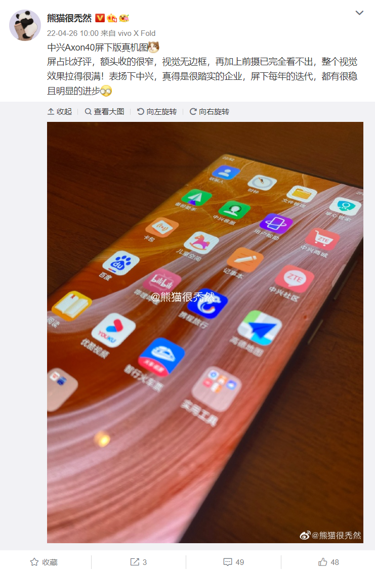 @熊猫很禿然 表示,中兴 Axon 40 屏下版额头收的很窄,视觉无边框,再加上前摄已完全看不出,整个视觉效果拉得很满。(来源:IT之家)
