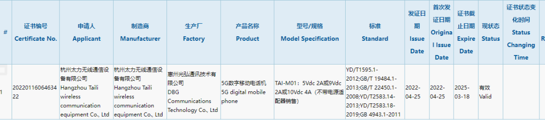 近日,杭州太力无线通信设备有限公司的 5G 新机 TAI-M01 通过了工信部认证,采用 6.5 英寸屏幕,额定 4100mAh 电池,搭载 Android 10 系统,尺寸为 158.6x72.5x8.8mm,有数码博主称其为华为智选的 Hi Mate 机型,外观类似 Mate40,可能会在本月底发布,5 月开售。