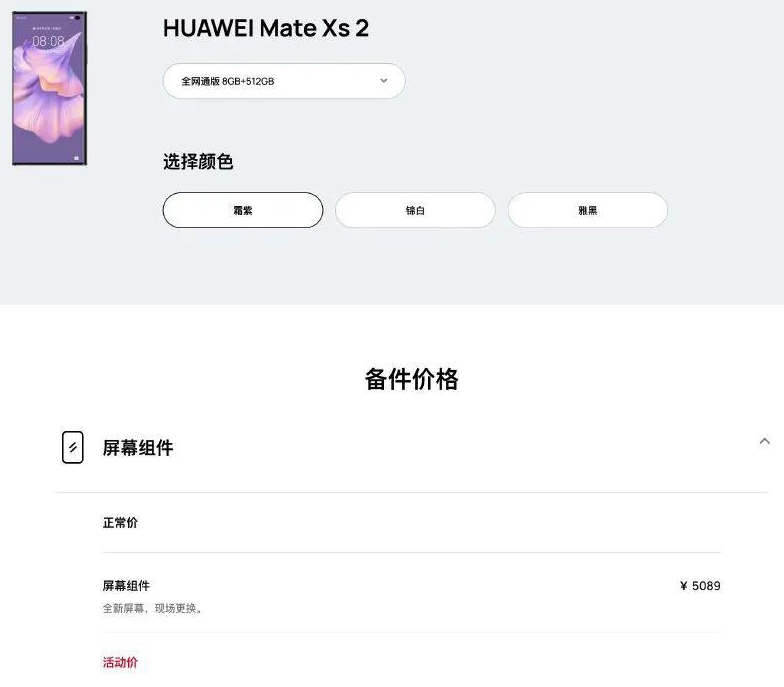 目前华为官网页面更新了 Mate Xs 2 维修的组件价格,其中屏幕组件价格为 5089 元,是整个手机最贵的组件,不过 Mate Xs 2 用户可享有一次优惠换屏,价格为 3899 元。