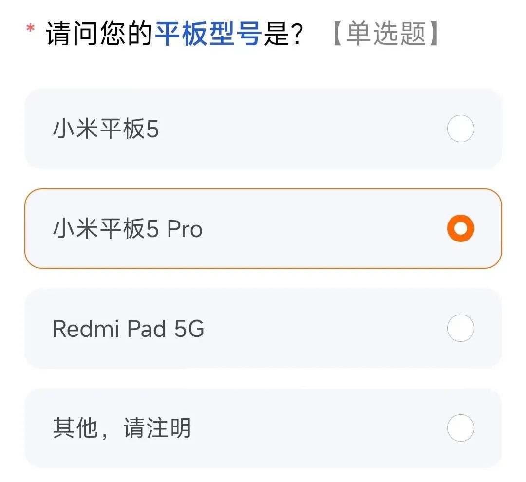 部分用户近日收到了小米发来的调查问卷,在一道题中出现了 Redmi Pad 5G 字样,似乎为 Redmi 品牌的新品。