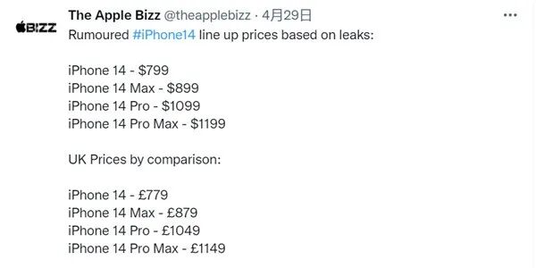据海外数码博主透露,iPhone 14系列全系的售价相比前代都上涨了100美元,具体价格如下:iPhone 14售价799美元(约5280元人民币);iPhone 14 Max售价899美元(约5941元人民币);iPhone 14 Pro售价1099美元(约7262元人民币);iPhone 14 Pro Max售价1199美元(约7923元人民币)。(来源:快科技)