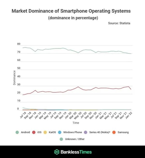 数据显示,安卓在操作系统领域的全球主导地位正在逐渐减弱。2022年1月,安卓系统全球市场份额为69.74%。相比之下,该操作系统在2018年7月占据了77.32%的市场份额,这也创下当时的历史新高。五年时间过去,有接近8%的全球市场份额从安卓手中溜掉。(来源:IT之家)
