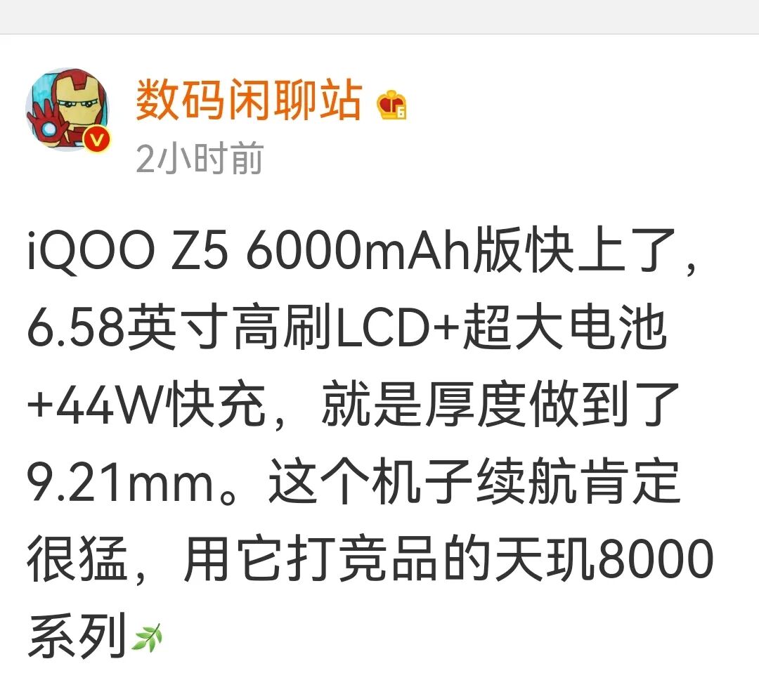 近日有爆料博主称,iQOO Z5 将推出一个 6000mAh 超大电池的版本,配备 6.58 英寸高刷 LCD 屏,支持 44W 快充,不过厚度到了 9.21mm。从爆料来看,新版本将电池容量增加了 1000mAh,厚度也从 8.49mm 变成了 9.21mm,屏幕缩小了一些,会和天玑 8000 系列处理器的手机竞争。
