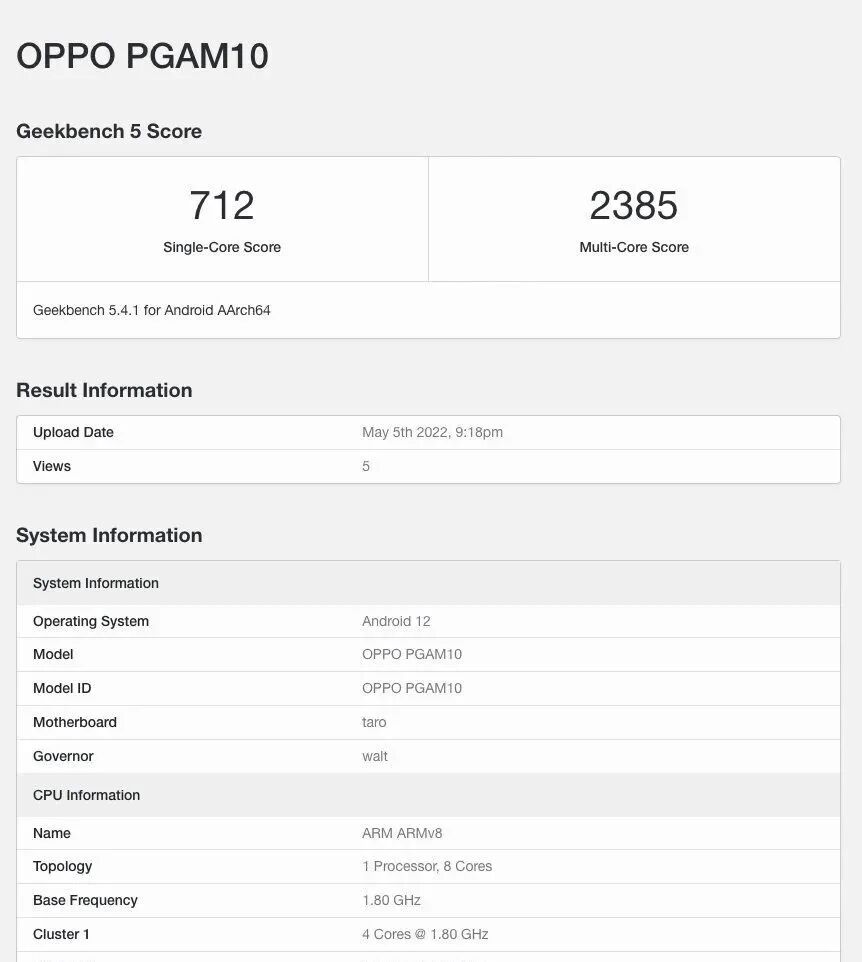 近日,一款型号为 PGAM10 的 OPPO 新机出现在了基准测试平台 Geekbench 上,根据此前爆料来看就是 OPPO 即将发布 Reno8。从 Geekbench 跑分来看,该机将搭载高通骁龙 7 Gen 1 芯片,运行 Android 12 系统,配备 8GB RAM。