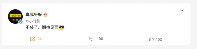 今日上午,真我平板官方微博正式上线并发布了首条微博“不装了,期待见面”。这也意味着,传闻已久的 realme Pad 即将正式与国内用户见面。