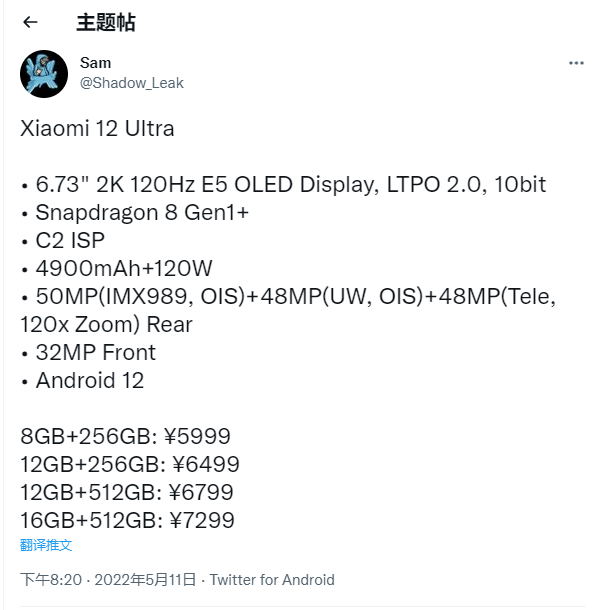 据海外爆料达人 Shadow_Leak 最新发布的信息显示,与此前曝光的消息基本一致,全新的小米 12 Ultra 将有望于 6 月与大家见面,除了将提供 8GB+256GB、12GB+256GB 和 12GB+512GB 三个存储版本,售价分别为 5999 元、6499 元、6799 元。
