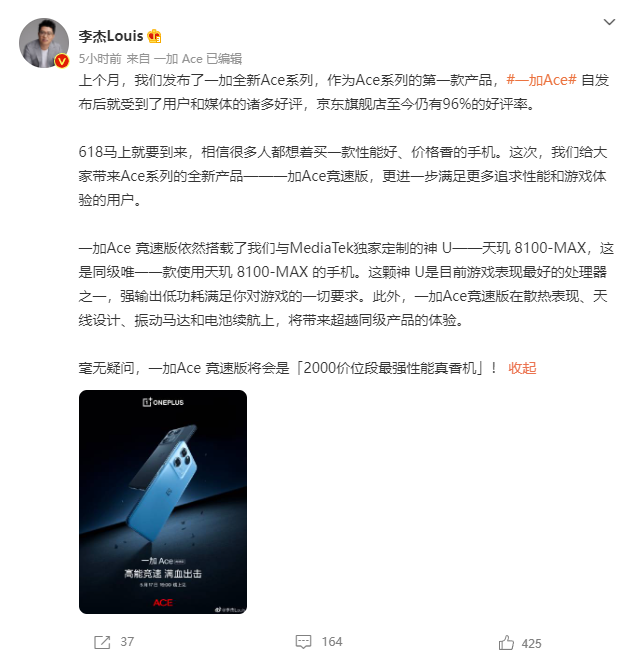 今日,一加官方微博宣布 Ace 系列迎来第二款新品:一加 Ace 竞速版。