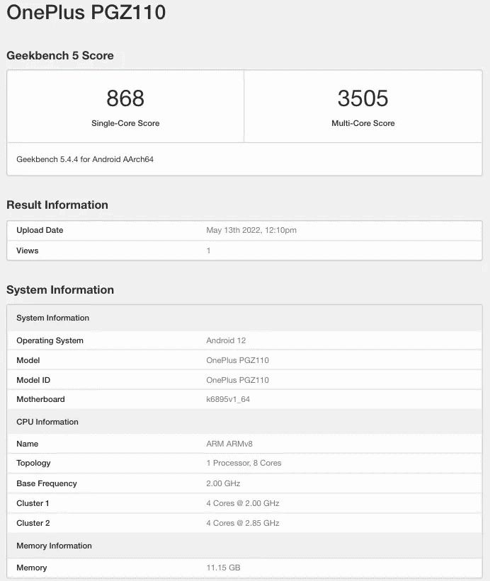 现在这款机型已经出现在看基准测试平台 Geekbench 上,显示该机搭载联发科天玑 8100-MAX、12GB 内存,运行安卓 12 系统。该设备型号为 PGZ110,在 Geekbench 5 上单核得分 868 分,多核 3505 分。(来源:新浪科技)