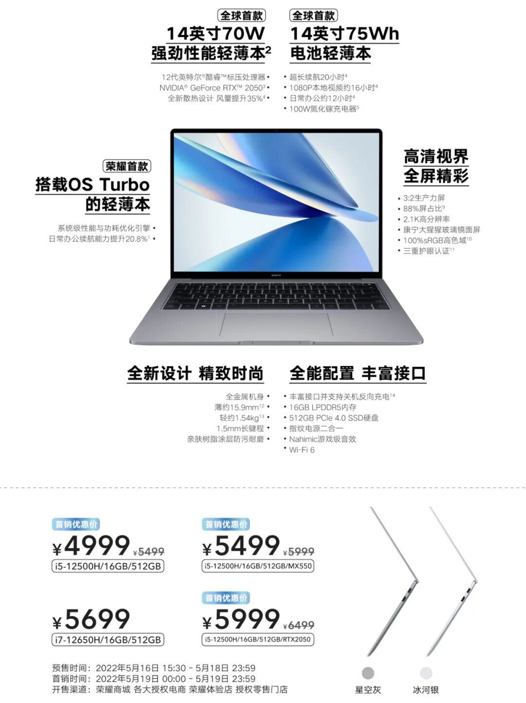 荣耀笔记本 MagicBook 14 全系 16GB LPDDR5 4800Mhz 内存 + 512GB PCIe 4.0 SSD 固态硬盘配置,14、15.6 英寸同价,5 月 19 日开售。
