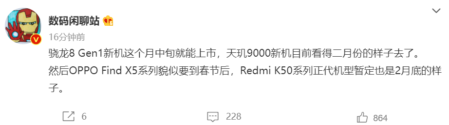 此外,该博主还表示,OPPO Find X5 系列预计需等到春节后,Redmi K50 系列正代机型暂定于 2 月底亮相。(来源:IT之家)