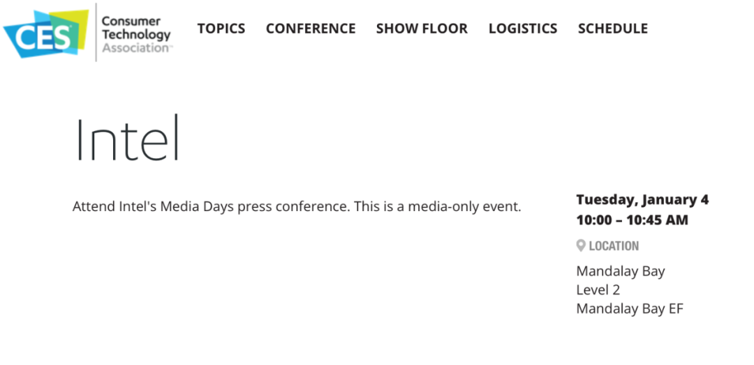根据 CES 2022 官网的消息,英特尔将于拉斯维加斯时间 1 月 4 日上午 10 点举行媒体发布会,也就是北京时间 1 月 5 日凌晨 2 点。