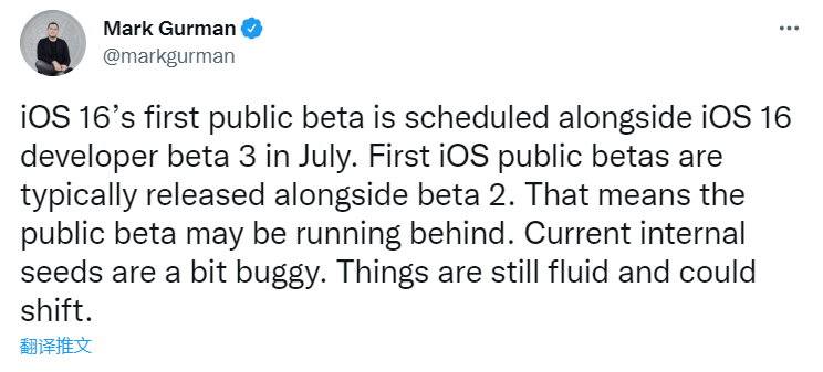 Gurman 在一条推文中说,今年的 iOS 16 测试版发布时间表有些不同。据该记者称,苹果计划在 7 月推出 iOS 16 的第一个公共测试版和第三个开发者测试版。而在往年,新的 iOS 版本的第一个公共测试版会与第二个开发者测试版一起推出。