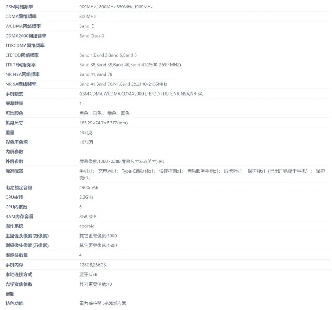 工信部信息显示,该机重 195 克,拥有 163.29×74.7×8.372mm 机身尺寸,采用 6.7 英寸 1080×2388 分辨率 IPS 屏幕,配备 4900mAh 额定容量电池。