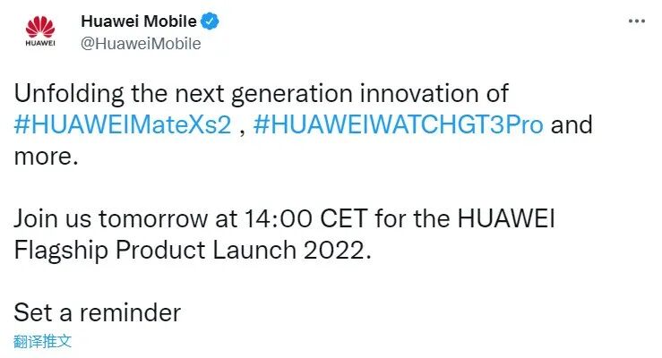 5 月 17 日消息,华为官推宣布,将于北京时间 5 月 18 日晚 8 点举行新品发布会,将在海外发布 Mate Xs 2 折叠屏手机和 Watch GT 3 Pro 手表。