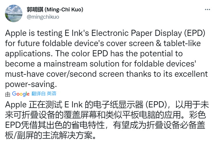 今日中午,天风国际分析师郭明錤通过Twitter表示,苹果正在测试EInk的电子纸显示屏(ElectronicPaperDisplay,简称EPD),用于未来可折叠设备的封面屏幕(CoverScreen)和平板电脑。