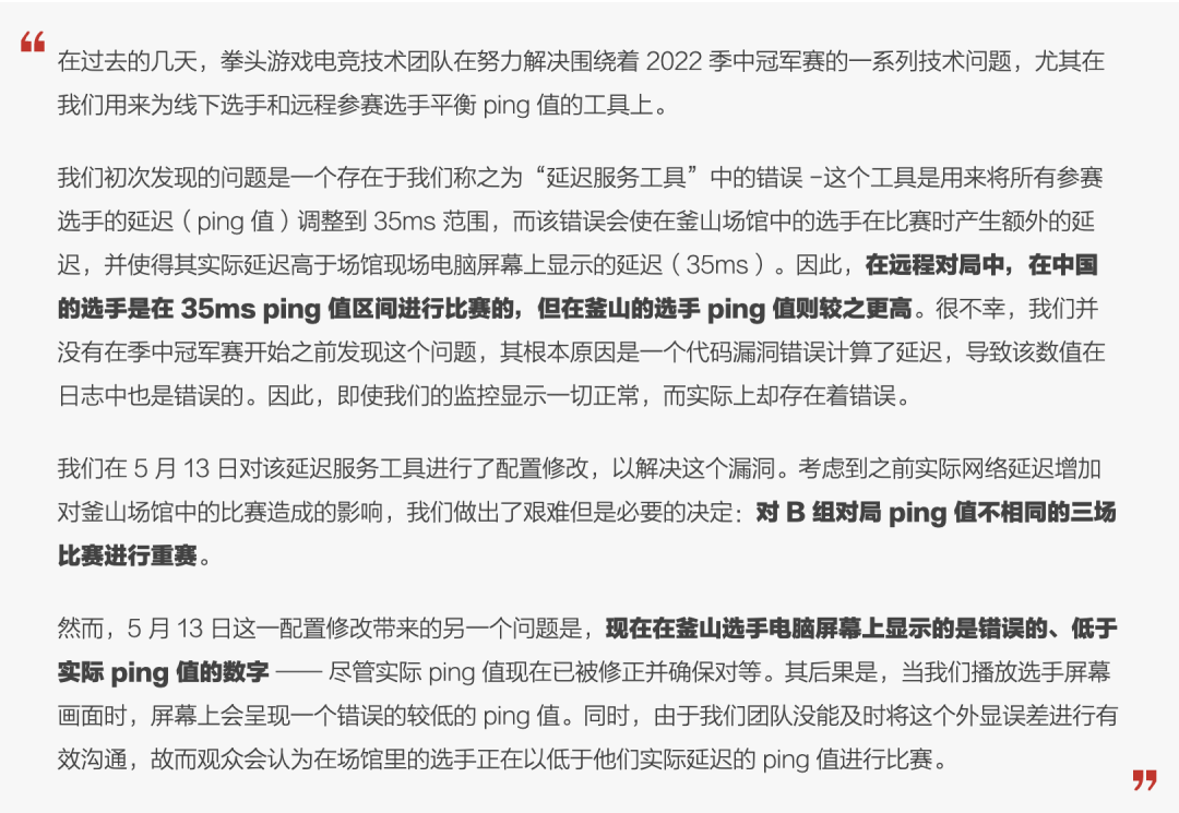 5 月 10 日,《英雄联盟》2022 季中冠军赛于在韩国釜山举办,LPL 赛区的季中冠军赛参赛队伍 RNG 在国内远程参加比赛。赛后,《英雄联盟》MSI 延迟不一的问题引起人们关注,一度登上微博热搜榜第八名。之后,拳头游戏就 MSI 上的延迟与重赛事件致歉,并表示将尽快分享一篇详细的技术说明。