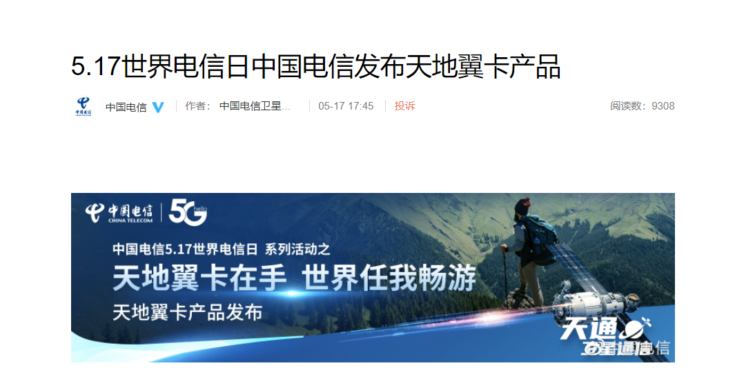 在 5 月 17 日世界电信和信息社会日到来之际,中国电信发布天地翼卡产品。