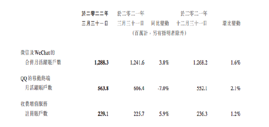 财报显示,截至2022年3月31日,微信及WECHAT的月活跃帐户12.9亿,预估12.7亿,同比增长3.8%。(来源: 新浪科技)