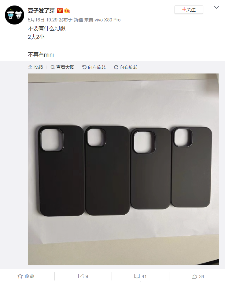 苹果 iPhone 14 系列的外观已经得到了多次曝光,渲染图、机模、钢化膜等。昨日晚间,数码博主 @豆子发了芽 放出了一张 iPhone 14 全系手机壳的图片,进一步确认了手机的大小。
