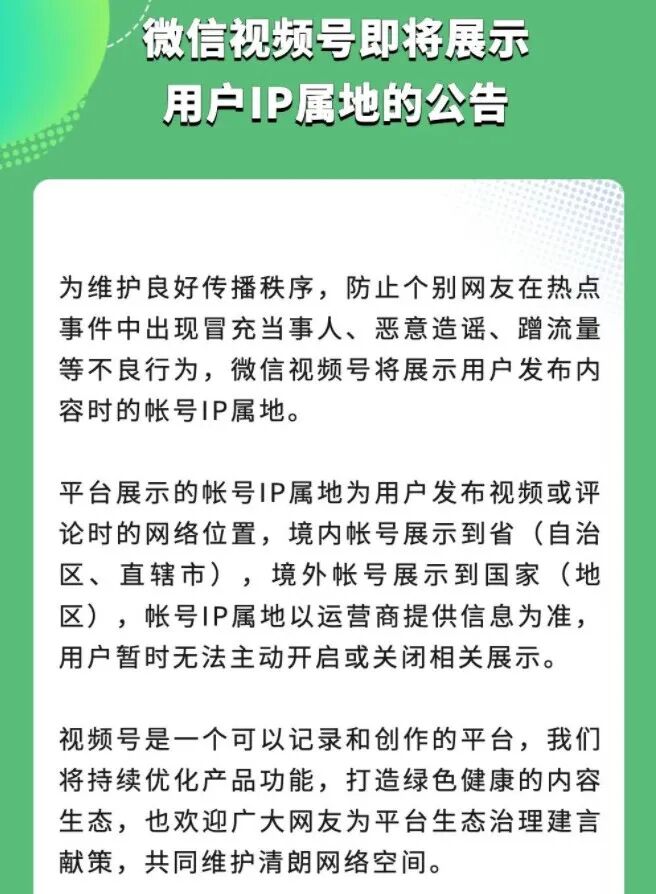 微信发布公告称,为维护良好传播秩序,防止个别网友在热点事件中出现冒充当事人、恶意造谣、蹭流量等不良行为,微信视频号将展示用户发布内容时的帐号 IP 属地。