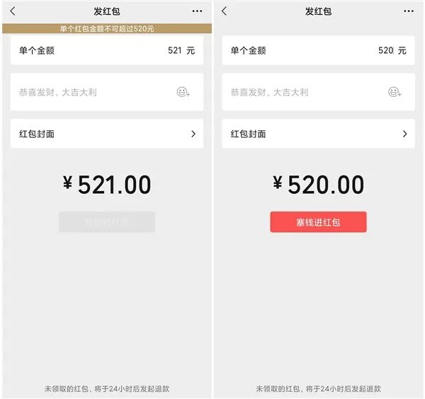 今日凌晨,微信红包的金额上限,特别从200元调整为520元,方便情侣之间互相表达心意。